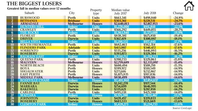 过去12个月中中位房价降幅最大的城区。(《澳洲人报》图片)