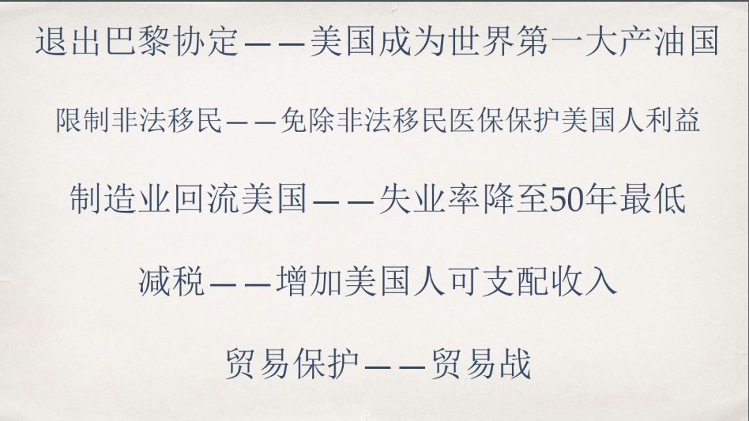 第四点就是减税。这个减税政策是特朗普在2017年的时候送给美国人的圣诞礼物,我一会会详细介绍这个减税政策。最后就是这个贸易保护。