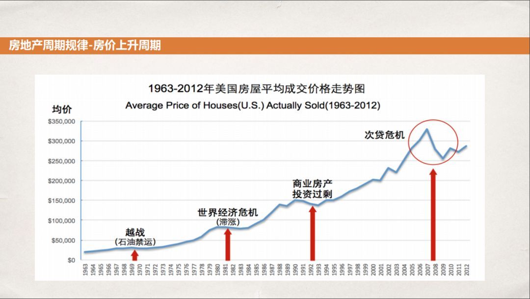 美国的房子周期性比较强,你可以遵循一些久远的历史数据。可能一百多年的历史走势来判断美国的这个房产的周期。美国房产数据的统计包括标普凯西-席勒指数,美联储也会从1970年到2018年每个城市的房价走势图。