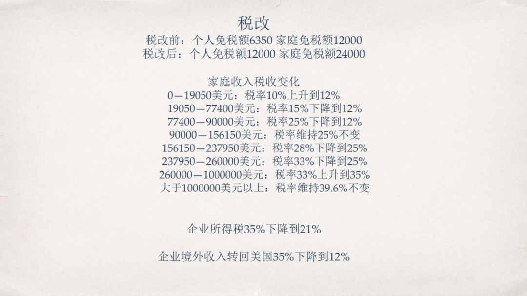所以对于低收入家庭来讲,可支配收入还是增长了。对于这个中等收入家庭来讲,它的税率优惠是最大,七万多到九万多美元,税率是从25%下降到了的12%。一百万美元以上收入的家庭的基本上是不变。