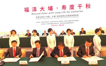 据悉,该活动由国际自然医学会、世界长寿乡科学认证委员会、梅州市大埔县长寿文化研究会共同主办。会上,国际自然医学会世界长寿乡调查团团长、世界长寿乡科学认证委员会主席森下敬一发表对大埔的长寿调查报告,宣布大埔为世界第八个长寿乡并颁发认证证书和授牌,大埔县委书记朱汉东接受牌匾;大埔县聘请森下敬一为大埔县经济社会发展战略顾问;大埔县长寿文化研究会会长袁光明公布获奖LOGO及宣传口号;此外,还举行了一批康养文旅项目的签约仪式。 全国人大代表邓振龙,海南省军区原副政委黄声云将军,中共梅州市委常委彭延虎,广东省老区建设促进会会长陈开枝,以及联合国世界旅游组织专家、亚太旅游协会中国专家委员会秘书长贾云峰;第六届全国政协委员,第七、八届全国政协常委邬沧萍分别作了讲话。