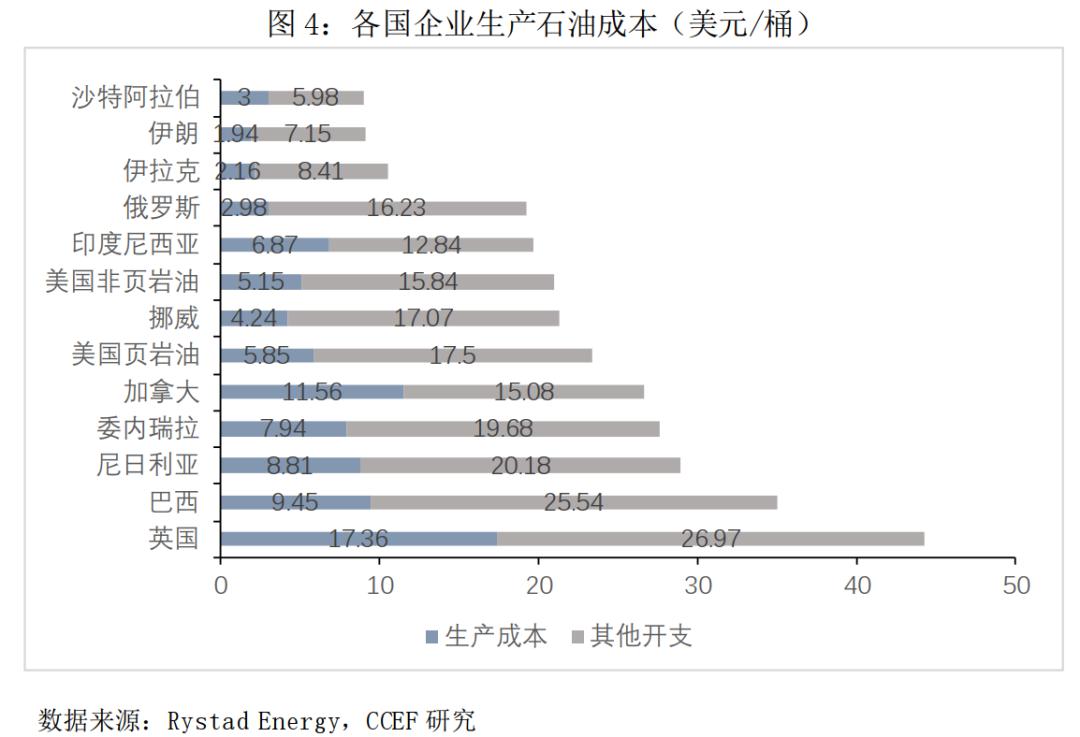 因此油价走势将由供给端主导。如果说短期石油价格底部是各石油生产国的边际生产成本,那么根据沙特(3美元)、俄罗斯(2.98美元)和美国(5.15美元和5.85美元)的数据,目前的国际油价还不足以使得石油企业陷入困境。