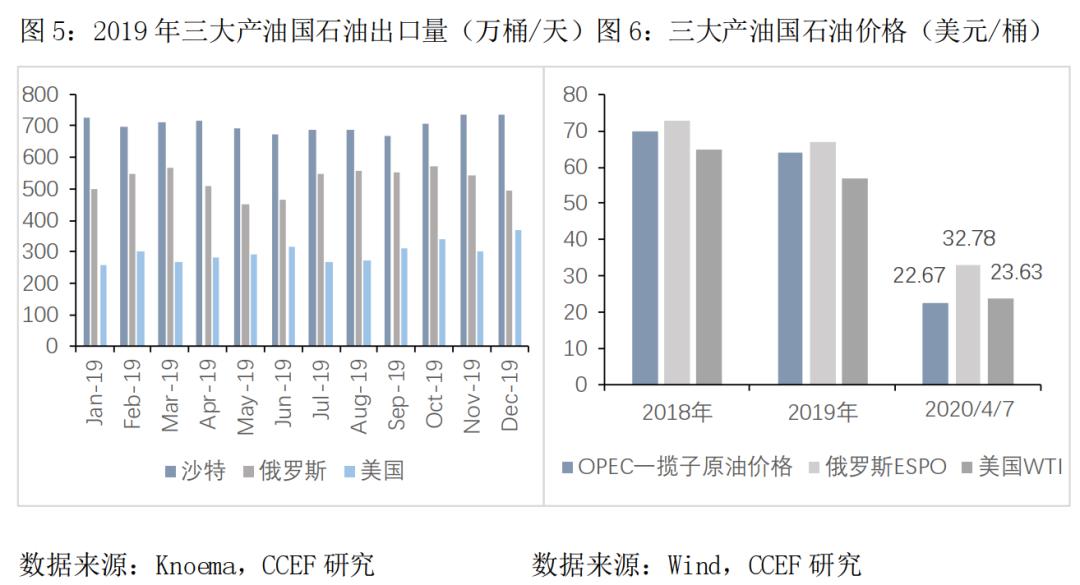 2020年3月6日,OPEC+会议未能达成进一步减产协议,俄罗斯能源部长诺瓦克表示从4月1日起,减产协议将终止。次日沙特发动“全面油价战争”,大幅调低售往欧洲、远东和美国等国外的市场的原油价格。3月9日,布伦特原油期货价格暴跌24.10%,创下有史以来单日第二大跌幅,而WTI原油期货价格暴跌24.59%。11日,沙特国有石油公司沙特阿美发布公告,将把原油最大持续产能从1200万桶/日提升至1300万桶/日,价格战进一步升级。4月份以来,OPEC及非OPEC产油国通过反复谈判达成了各种形式的减产协议,但这些协议的执行效果仍有待观察。