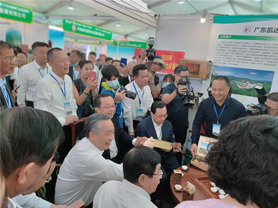 ▲院士、领导在凯达茶业展位一边品鉴嘉应茶,一边为梅州茶企支招。