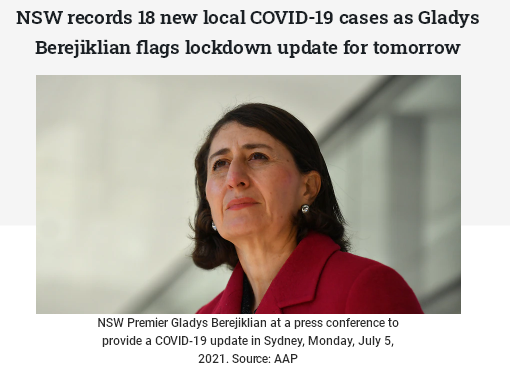 据悉,在新州新确诊的18个本地病例中,有11人处于隔离状态,5人处于部分隔离状态,两人曾在传染期内在社区活动。新州州长贝瑞吉克莲(Gladys Berejiklian)表示,第二周的封锁对控制疫情“至关重要”,大悉尼地区的封锁正在产生其预期的效果。关于封锁是否会延长到本周五(9日)以后,贝瑞吉克莲称将会在明日(7日)公布。