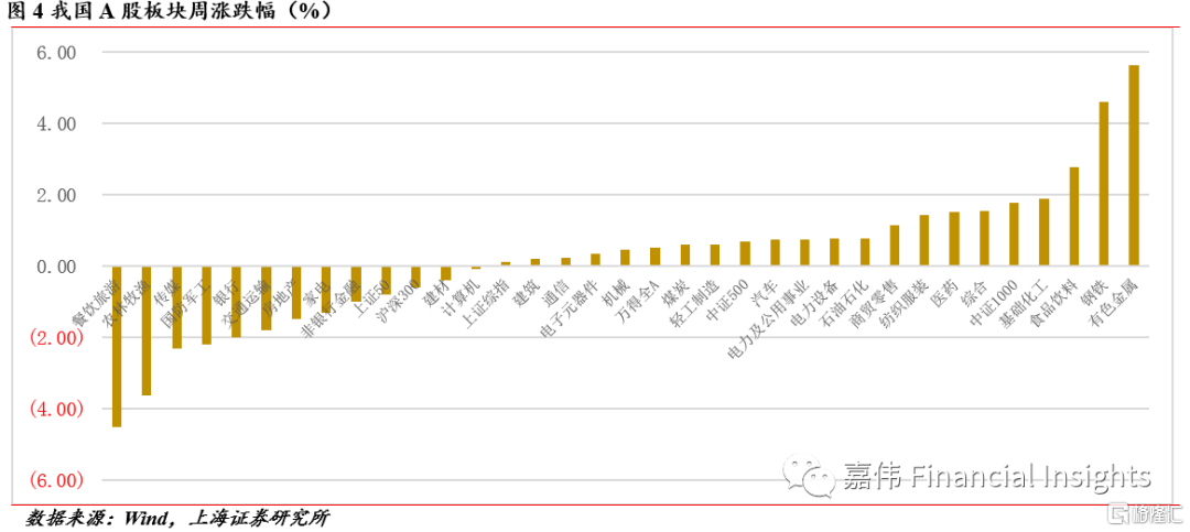 行业角度,国内A股市场有色金属和钢铁周涨幅较大,分别为5.63%、4.59 %,消费、基础化工和医药继续表现出色。受疫情形势加重,餐饮旅游板块出现大幅下跌,为-4.5%。农林牧渔、军工、传媒等领跌。