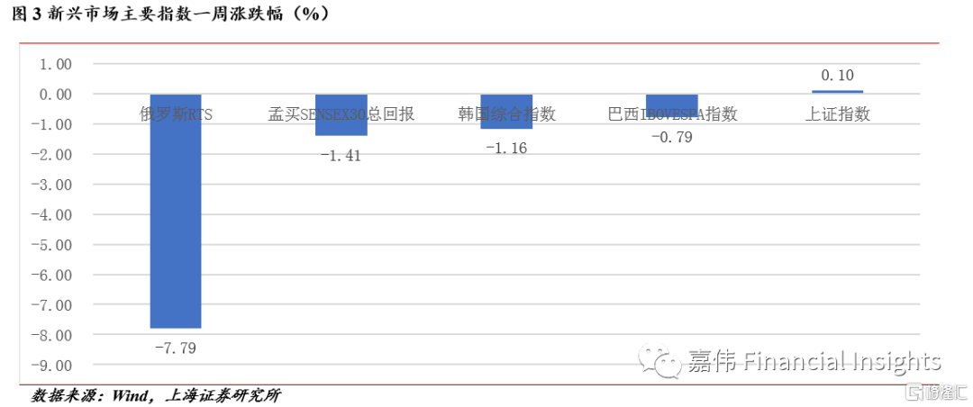 新兴市场行情分化。得益于我国疫情控制良好,我国上证指数上涨0.1%。其他指数均表现下跌,孟买、韩国、巴西市场均表现下跌,幅度在1个点上下。俄罗斯RTS指数下跌幅度最大,为-7.79%。
