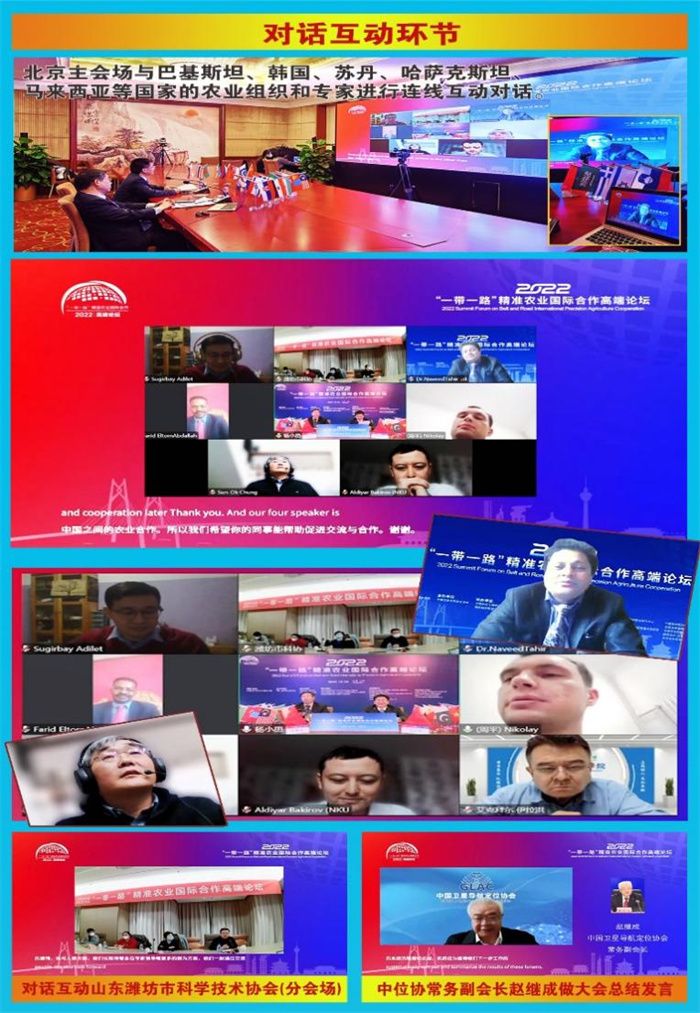 互动对话现场,来自韩国精准农业学会主席、国立忠南大学教授郑先钰(Sun-OK Chung)、巴基斯坦PMS干旱农业大学副教授纳维德·塔希尔(Naveed Tahir)、哈萨克斯坦农业技术大学的代表张扬(Sugirbay Adilet)和周平(Zagainov Nikolay)、北哈萨克斯坦大学的阿尔滕(Shayakhmetova Altyn)、苏丹非洲科技城(ACT)的代表法瑞德.阿布达拉(Farid Eltom Abdallah)等与主会场进行视频连线互动交流,他们均表达了对在中国建立“一带一路”精准农业国际合作联盟的积极响应和支持。