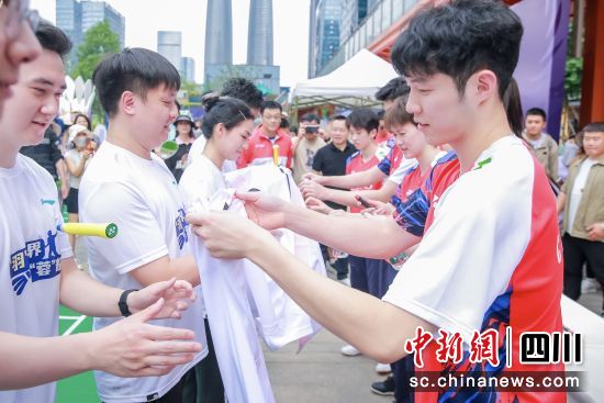 在成都高新区交子音乐广场,他们与市民共同参与了趣味游戏,体验了VR羽毛球与体感羽毛球机,并与市民进行友谊切磋,还赠送了签名球衣。
