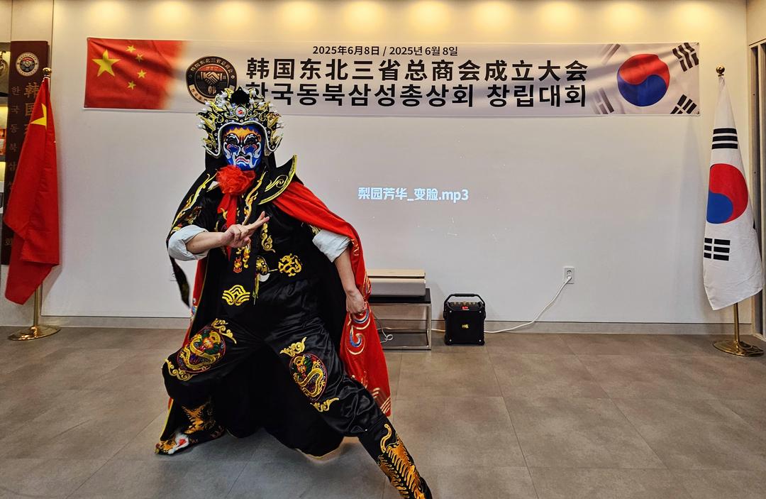 在成立大会上,在韩同胞艺术家表演变脸节目
