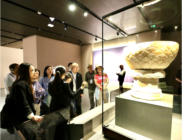 吴越文化博物馆作为临安文化的重要展示窗口,也吸引了媒体代表们的目光。该馆占地面积4.1万平方米,建筑面积1.45万平方米,展陈面积6500平方米,共展出文物350件(套),其中一级文物150件(套),珍贵文物占80%,大量文物精品为首次亮相。从鎏金银器、秘色瓷的工艺巅峰,到石刻碑文的治国思想,媒体代表们通过全景式展陈以及全息影像,深入了解了吴越国“保境安民、造福东南”的历史功绩。从钱镠筑海塘、兴水利的治世智慧,到“善事中国、纳土归宋”的政治远见,展柜中的一件件精美文物,不禁让人感叹吴越匠人的巧思与运河沿岸手工艺传统的深厚底蕴。