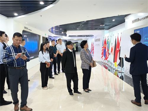 世界客属总商会名誉主席、欧中之声文化传媒集团副总裁周万名(左五)、柬埔寨公主阿龙拉斯美(左六)一行参观启迪控股数字展厅,启迪控股副总裁、启迪之星总经理沈全洪(左七)陪同