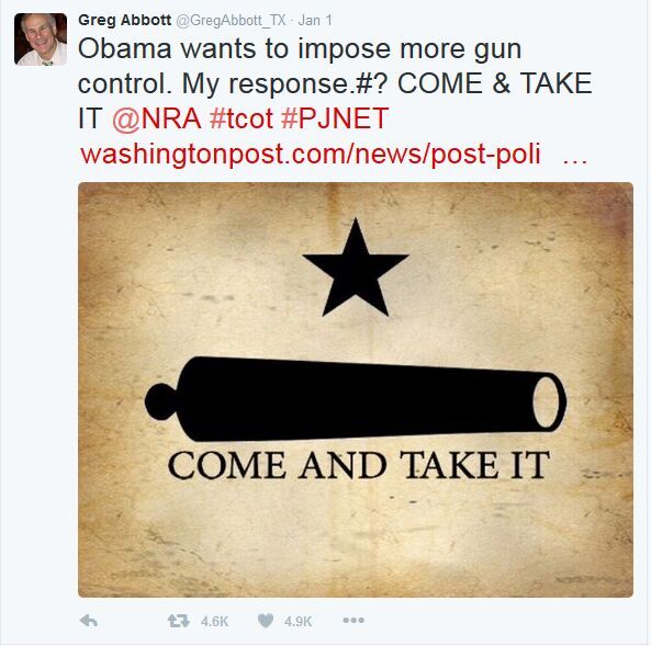 美国总统奥巴马在控枪问题上一直频繁“吃瘪”,由于反对者众多而无法通过控枪法案。在任期最后一年,奥巴马决定奋发,要越过国会,在新的一年以采取行政命令的方式限制枪枝暴力。公开持枪的德州立即反呛。德州州长艾伯特1月3日向奥巴马发出挑战,他在推特上贴出大炮图案,扬言奥巴马“有胆来拿”,到德州亲自收缴枪枝。