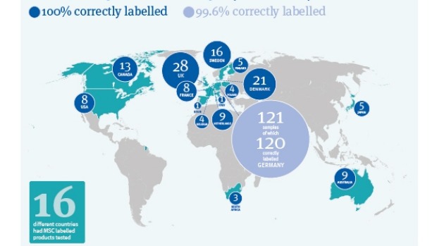 在周二公布的《从海洋至面板:DNA检测如何追溯环保海鲜》报告中,MCS表示,在最近一轮的DNA检测中,99.6%MSC认证的鱼类有正确标记。错误标记包括非法和无管制的捕捞、消费者健康影响、欺诈消费者、不受管控的濒危海鲜交易等类别。
