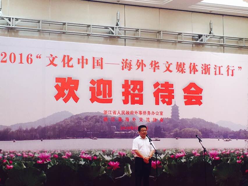 2016“文化中国——海外华文媒体浙江行”欢迎招待会在浙江省人民大会堂举行,浙江省人民政府多位领导出席,其中,浙江省人民政府侨务办公室副主任王通林主持欢迎招待会,他表示,各位媒体朋友近日来马不停蹄地进行考察访问活动,对媒体朋友的辛苦致以慰问。大家来到浙江,感受浙江的青山绿水,以及体会浙江的吴越文化和江南文化,相信大家对浙江有更加深入的了解。其后,浙江省宣传部副部长、新闻办主任来颖杰致欢迎辞,欢迎媒体朋友们来到浙江,感谢大家对浙江各方面的宣传和报道,感谢海外华文媒体一直以来对浙江的支持。