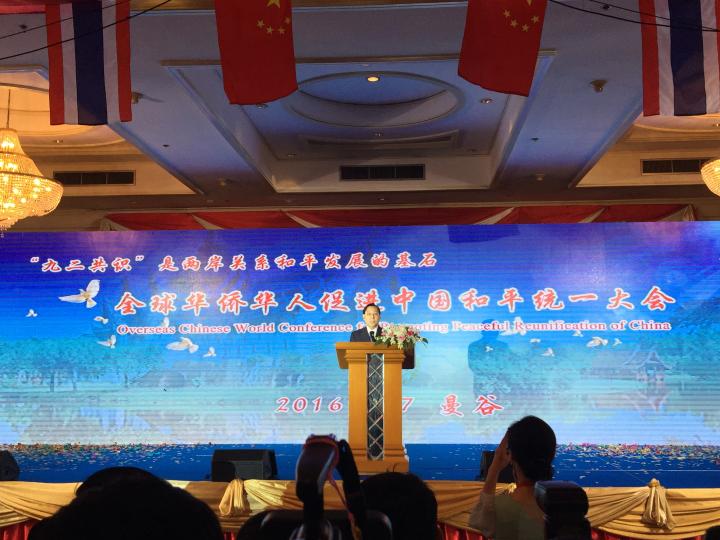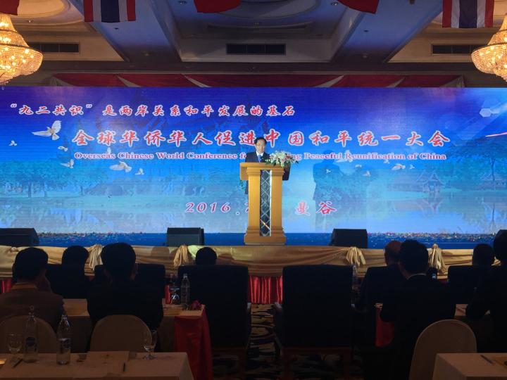 泰中文化产业集团(记者/杨千慧 摄影/宋胤泽) 7月7日上午,“2016全球华侨华人促进中国和平统一大会”在泰国曼谷隆重开幕。此次大会围绕“九二共识是两岸关系和平发展的基石”主题,旨在更好地凝聚全球华侨华人“反独促统”力量,促进新形势下和平统一工作的经验交流与合作,维护两岸关系和平发展和台海和平。来自中国全国政协、国务院台办、国务院侨办等国内部门和世界各地统促会的负责人、泰国多位政要、华侨华人代表及国际友人等近千人出席了当天的活动。