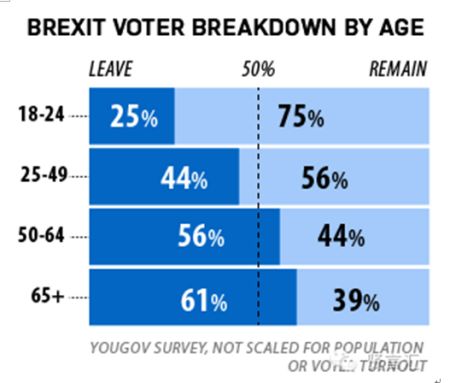 据统计,在此次投票中老年人多数想离开欧盟,而年轻人多数都想留在欧盟,因为他们更看重未来的学业和职业机会,以及与各国之间的自由交流,比如大学生交换项目ERASMUS。但实际上老年人投票率远远高于年轻人,现在投票结果也表明了投欧派获得51.89%,而留欧派是48.11%,换个角度来看,等这些投票退欧的老年人离开人世后,承受后果的却是这班还在备受煎熬的年轻人。