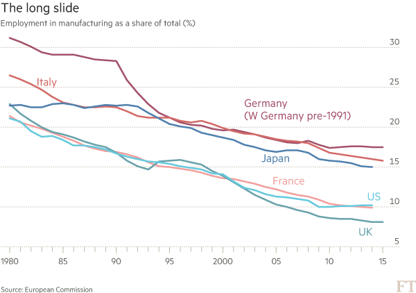 第五,打击“庸医”。人们要求控制没有一技之长的劳动者流入发达经济体,这种压力是不可能抵抗的。但这并不会改变工资。同样的,反对进口的保护主义措施代价高昂,并且无法显著提高制造业在总就业中的比例。的确,德国的这一比例比英美要高得多。但德国有高额的贸易顺差,在制造业有很强的比较优势。这并不是一种能够一般化的情况。(见图)