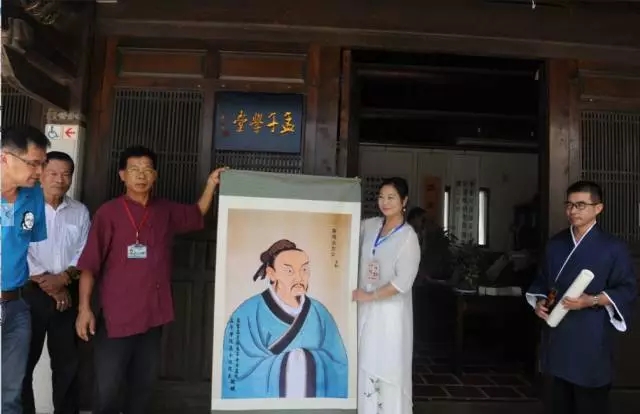 (图)孟子书院院长孟小红向金门县文化局局长吕坤和赠送《亚圣孟子像》