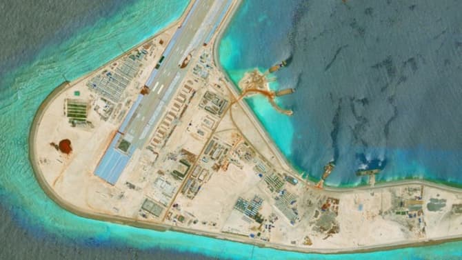 美国智库分析卫星图像后称,三个争议岛礁上的机库都可容纳多架战斗机,尽管尚无证据显示中国进行了军事部署。