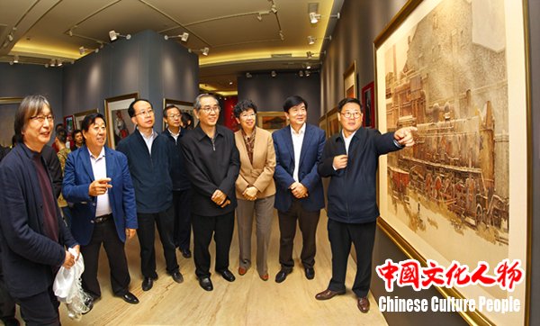 中国美术家协会分党组书记兼秘书长徐里向全国政协副主席马飚,中国文联党组书记、副主席赵实,中国文联党组副书记、副主席李屹,中国文联党组成员、副主席、书记处书记左中一,中国文联党组成员、书记处书记陈建文,中国文联副主席、中国美术家协会主席刘大为等领导及嘉宾介绍展览作品 中新社发 王保胜 摄