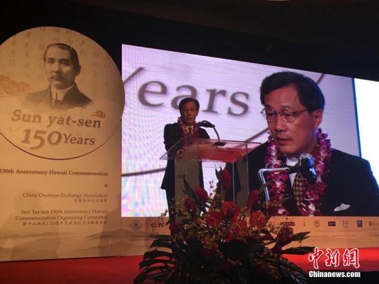 图为夏威夷纪念孙中山诞辰150周年活动筹委会成员、美国格律文化传媒集团董事长谢一宁12日在大型纪录片《孙中山与华侨华人》美国首映典礼上发言。 中新社记者 张朔 摄