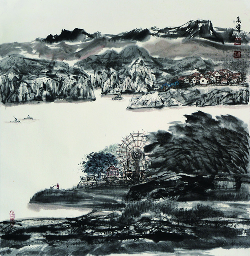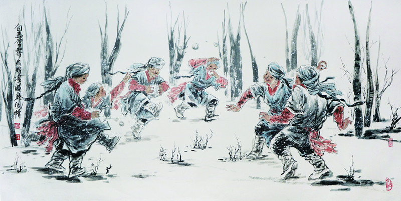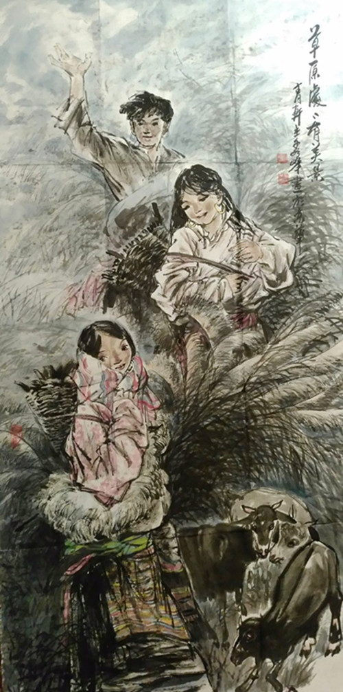 笔墨连着胸襟。胸襟的开拓带动着笔墨的深化。李秀峰20余年的军旅生涯和二十几年的专业画家经历都在西部这片雄浑壮阔的土地上度过。无数次采风写生,无数次深入生活,她都是以一颗真诚坦荡的艺术家之心,一份澎湃高涨的创作热情去完成的。她为黄土地所痴迷,为大草原所陶醉,为有着牦牛般健壮体魄和高山大海般宽阔胸怀的藏民族所深深吸引。她的画笔越来越勤奋地描绘起心中的这一切。渐渐,人们记住了李秀峰的西部藏族人物画:《在那遥远的地方》、《走向圣土》、《回归之路》、《红墙下》、《欢歌劲舞》、《高原太阳》、《八月来风》……。人们喜欢这些画的水墨氤氲、酣畅淋漓;饱满凸现的人物,充分表现出高原人特有的坚韧与力量,面容却释放着内心的平和安详,妇女们眉间流溢着幸福与慈爱,小牧童质朴憨拙,形态充满动感,大有呼之欲出之势。简练的笔法,恰到好处的点墨色块,使人性的完美、自然界的磅礴、精神的纯净那样和谐地统一在一起,体现着画家对人的命运的关注,对人类美好情感的肯定与赞扬,也体现着画家对艺术的宏观把握与对生活的敏锐感知。