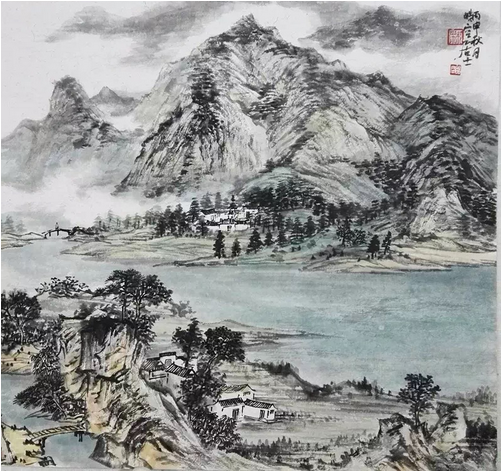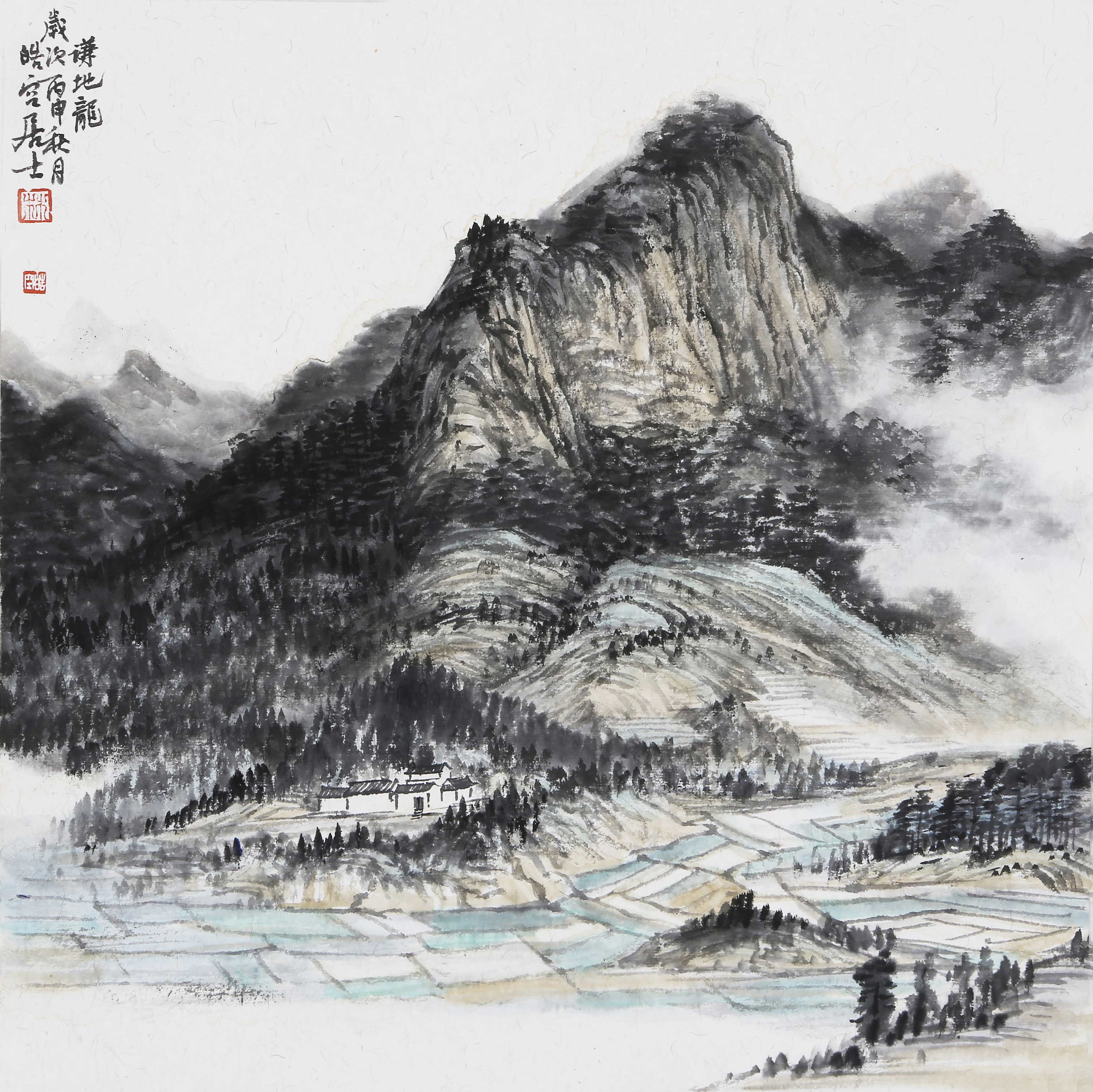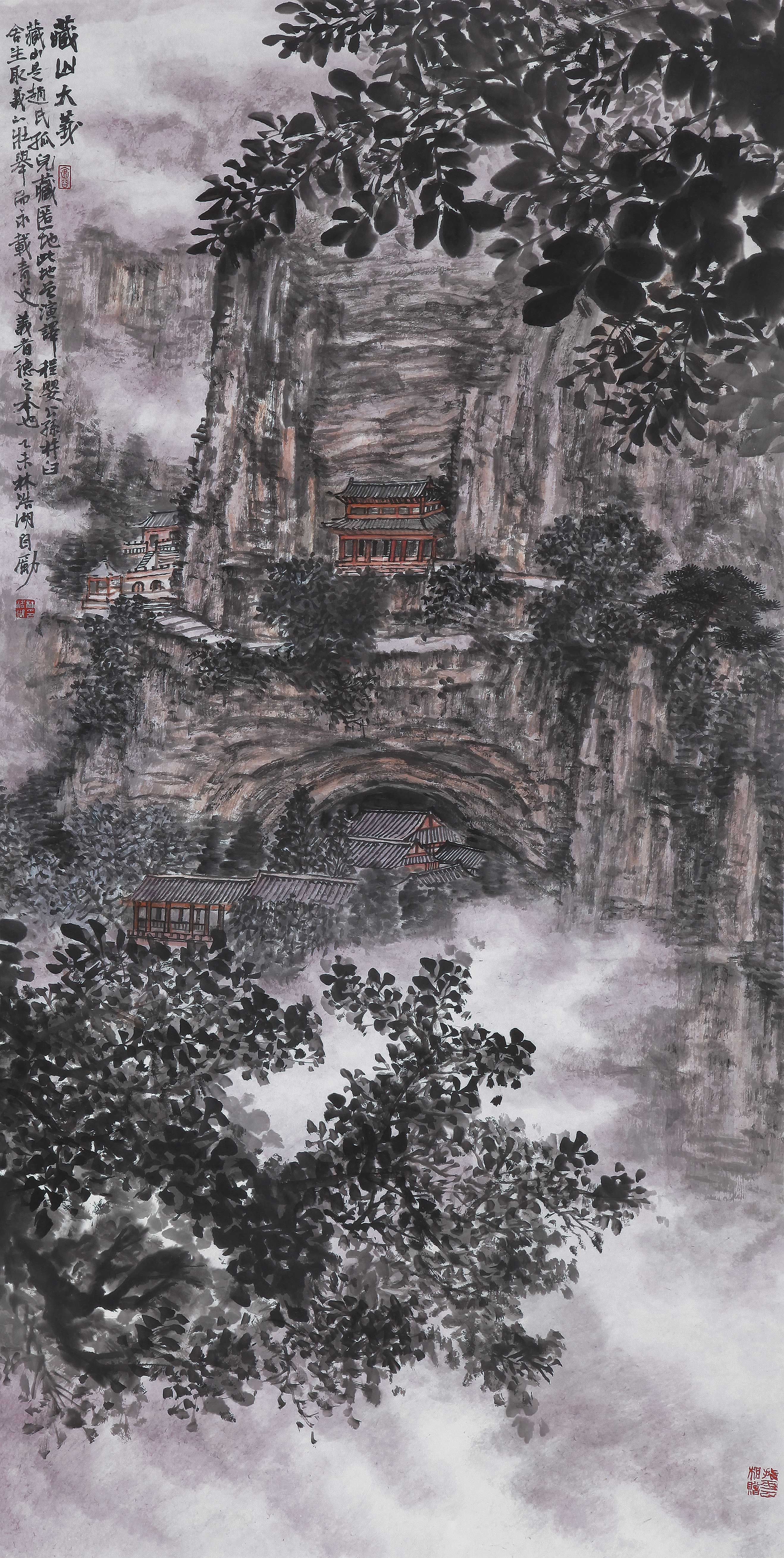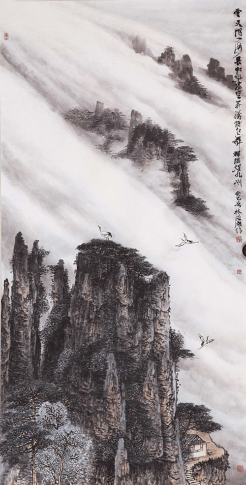 山水画题材的创作往往体现一位画家的整体水平。林浩湖先生的有些作品就只表现山谷和云,不涉及水瀑,又很贴切易经风水精神,这画画领域可以说不按常规。"山为筋骨,水为血脉,云烟为气韵;"可是他山水画中透露出的祥瑞之气,这在专家手里本来不易表现。一来容易被画理、画论所局限,一个是容易被经营位置所局限。理气派对风水有一段阐释;"山谷以藏风为贵,只要穴场藏聚,乘得生气.发达极快,何必拘泥有山无水..."而且山水画图式中"龙大脉小""太祖、少祖、明堂、朝案罗列清晰"不难做到,林浩湖先生还钻研五行之山在山水画中的创作.可以说这在画史上也是少见的。从而弥补了山水画类别的空白。是的,山水得气则生, "气韵生动"与风水学中的"藏风聚气"在他画作中几乎是体用兼备,理法自然了。虚实相生这是中国画内在的化生与画境高妙的体现。林浩湖先生对山水画的贡献不单是借虚衬实,他充分发挥了以刚柔见虚实,他提出了实处不离虚,如同黑中不离白,黑白的运行是相互作用的;古代名作无不在无画处求画意,通过万有的"无"来体现"有"的价值。易经中也常讲时空转换的智慧。他的山水画依托虚实来体现易经风水文化的价值。清代笪重光《画筌》云:"虚实相生,于无画处皆成妙境。"又讲:"今人用心在有笔墨处,古人用心在无笔墨处,倘能于笔墨不到处观古人用心,庶几拟议神明..."林浩湖先生作品《东方红》、《南梁革命根据地》、《延安颂》、《太行迎旭》等巨幅作品另人观后有种"真气内充,劲健含化"的感觉.山水画要得神首要是精于"计白当黑",从空无或虚白处生境,这对艺术家讲是"胸罗万象,感而会通".《易经》讲:"感而遂通天下之志,成其典要";在兵书讲:"形胜.";佛家讲:"一切唯心造";道家讲:"羽化而成仙";是古人对天地人三才的一种妙觉,其融会贯通后生命境界升华的呈现,犹如道家的"逍遥游"、佛家的"大自在"、儒家的"圆融通达"、画家的"造化于胸,随机而化" …