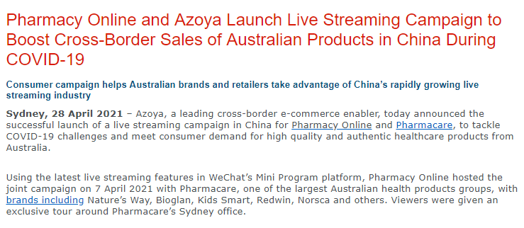 深圳跨境电商支持公司Azoya28日宣布,为澳洲医药平台PharmacyOnline公司和Pharmacare公司成功举行了直播活动,将澳洲保健品推荐给中国消费者。PRWIRE网站报道,在Az