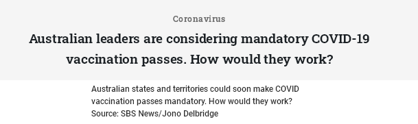 澳洲领导人正在考虑强制性的新冠肺炎疫苗接种,并推出新型冠状病毒绿色通行证。根据澳洲内阁正在考虑的一项计划,澳人不久将被要求出示接种疫苗证明,方可进入酒吧、