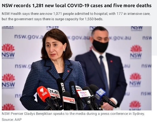 6日报告的全澳新增病例中,新州新增1281例新冠肺炎本地病例,维州新增246例。在新州疫苗接种数已超过750万剂后,新州或将在10月中旬解封,而维州边远地区或将在本周解
