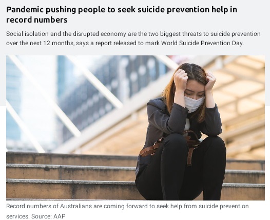 9月10日是世界预防自杀日。根据为纪念世界预防自杀日发布的一份报告称,疫情期间,澳洲的自杀问题十分严重,而社会孤立和经济混乱是未来12个月的两大自杀威胁。SBS报