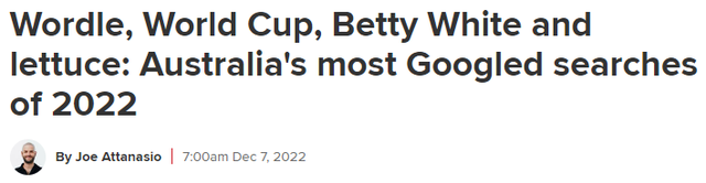 还有几周的时间,2022年就要正式结束了,世界上最受欢迎的搜索引擎Google也揭示了今年澳人搜索最多的一些关键词。图文无关(图片来源:网络)健康、体育和战争在很大程