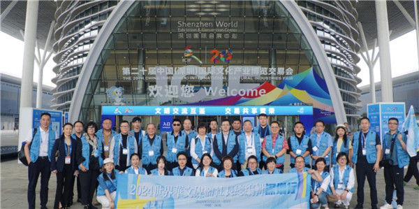 世界華文媒體社長總編輯沉浸式體驗文博會(記者李溪攝)在文博會火爆舉行之際,參加「2024世界華文媒體社長總編輯」深圳行的媒體高層24日沉浸式體驗文博會,既感受中
