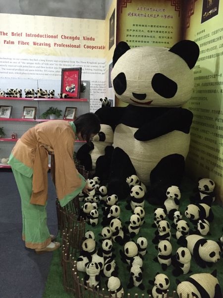 新都知名电商企业展示区的新都棕编大熊猫。(汤雁摄)跨境电商节现场。(纪杰摄)国际友人购物节上购物。(汤雁摄)2016首届成都(新都)•前海国际跨境电商购物节开