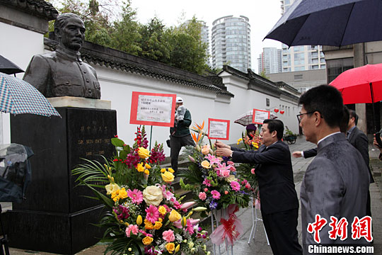 旅居温哥华的华侨华人当地时间11月13日举行活动,纪念孙中山诞辰150周年。在座谈会开始前,部分与会代表在华埠中山公园向1993年开始矗立于公园入口处的孙中山铜像献