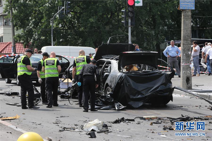 6月27日,在乌克兰首都基辅,调查人员勘查轿车爆炸现场。乌克兰国防部27日发布消息说,乌首都基辅当天上午发生一起轿车爆炸事件。驾驶轿车的乌国防部侦察总局现役上