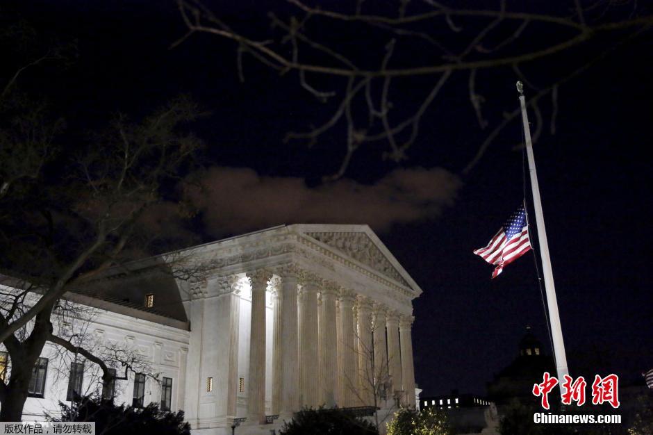 当地时间2月14日,美国华盛顿,美国最高法院降半旗悼念大法官斯卡利亚。据媒体报道,美国最高法院在职期间最长的大法官斯卡利亚13日在得克萨斯州西部一处度假牧场逝