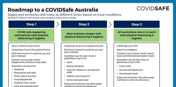 虽然澳洲政府计划是7月完成这三步,不过解封的步骤都是基于澳洲疫情稳定控制的前提,总理也表示会每3周重新评估review一次,以便及时调整联邦层面的解封措施。每个州和领地政府将自己决定怎样推进和实施放宽限制!