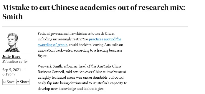 一位澳洲商业领袖近日表示,包括在授予赠款方面实施越来越严格的举措在内,澳洲联邦政府对于中国的鹰派做法可能会适得其反,让澳洲的创新成为一潭死水。《澳洲金融评