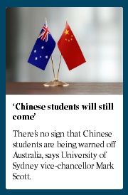 悉尼大学副校长斯科特(MarkScott)7日在悉尼委员会(CommitteeofSydney)的吹风会上表示,他有信心认为,中国留学生将返回澳洲八校联盟(GroupofEight,以下简称Go8)成员