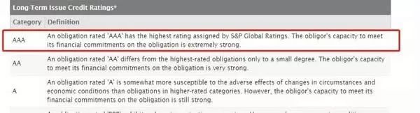 标准普尔(S&P)作为金融投资界的公认标准,其对全球债券信用评级分为10个等级,其中AAA为最高级别,代表安全性最高,偿还债务能力极强。