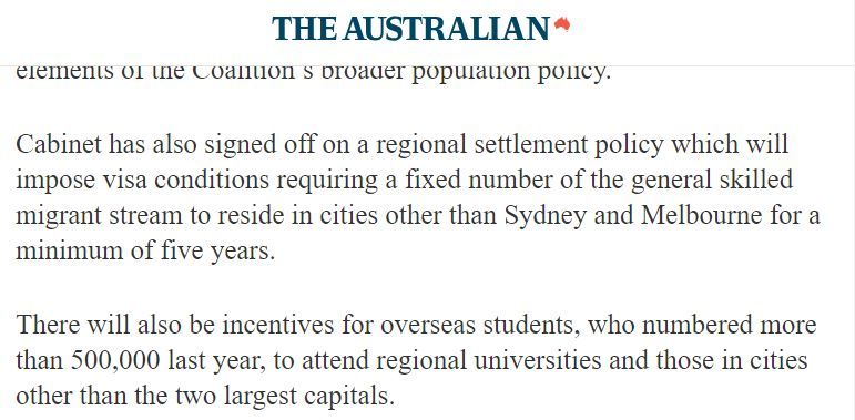 澳洲政府已经签署了区域安置政策,要求固定数量的技术移民群体必须要在悉尼和墨尔本以外的城市至少生活五年时间。