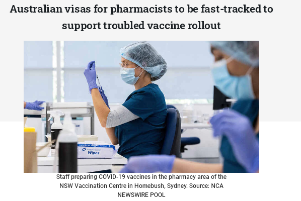 联邦政府将快速审批药剂师的签证,以支持澳洲正在进行的新冠疫苗推广。联邦移民部长霍克(AlexHawke)于27日宣布,该职业将被列入优先移民技术职业清单(PMSOL)。据悉