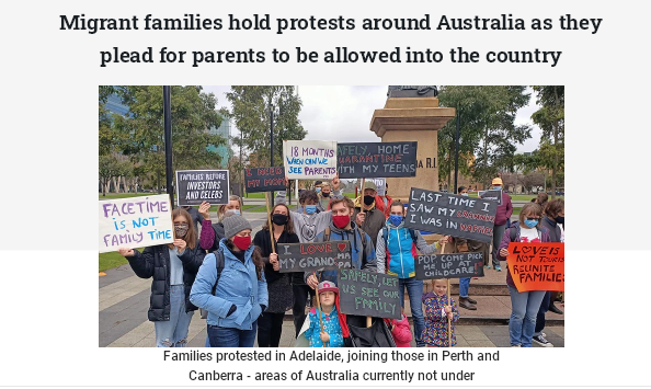 自新冠肺炎疫情暴发以来,移民澳人已经与居住在海外的父母和祖父母分开超过18个月。对此,一些抗议者在未被封锁的澳洲城市集会,呼吁改变旅行豁免,以便让澳洲公民和